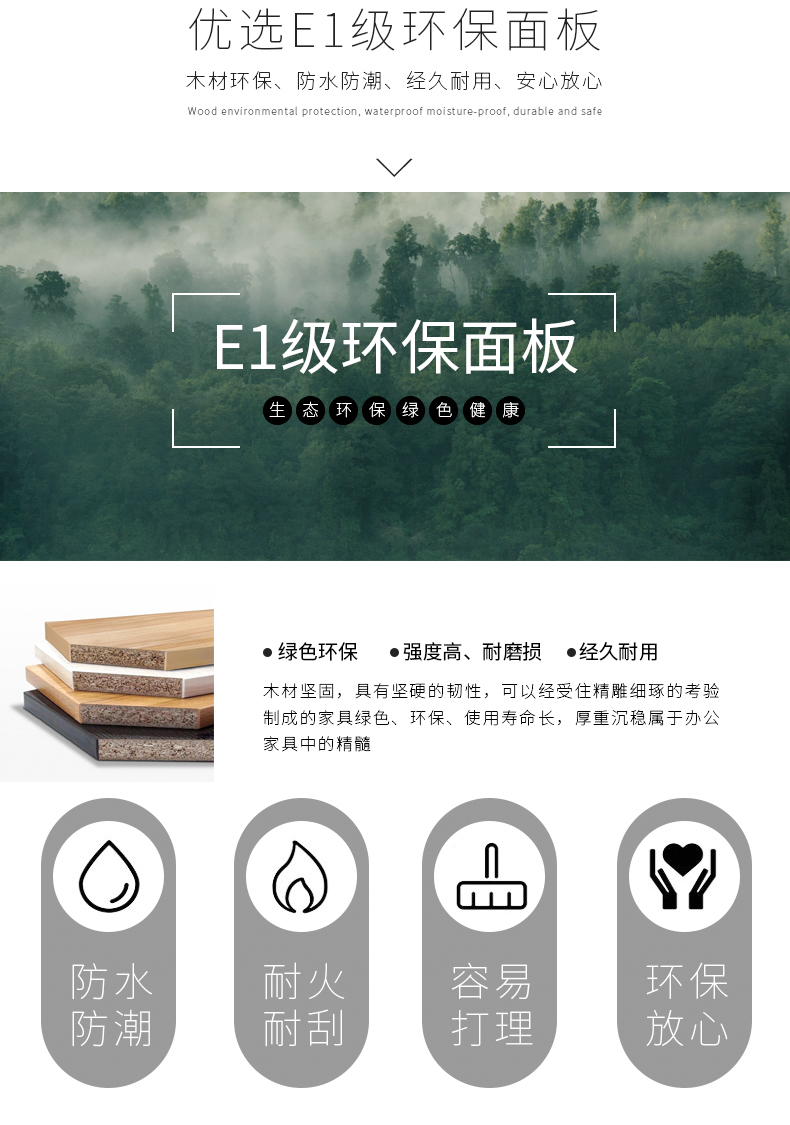 基 材:E1級達歐洲環保標準基材(目前國內辦公家具行業板式基材標準較高的),此基材用原木壓縮顆粒成型,甲醛含量小于1.2MG/L,具耐磨、抗刻劃、耐高溫、易清潔、耐酸堿等優點,經防蟲、防腐處理,表面握釘力及靜曲強度均達到國家標準;抗彎性能強,不易變形。
